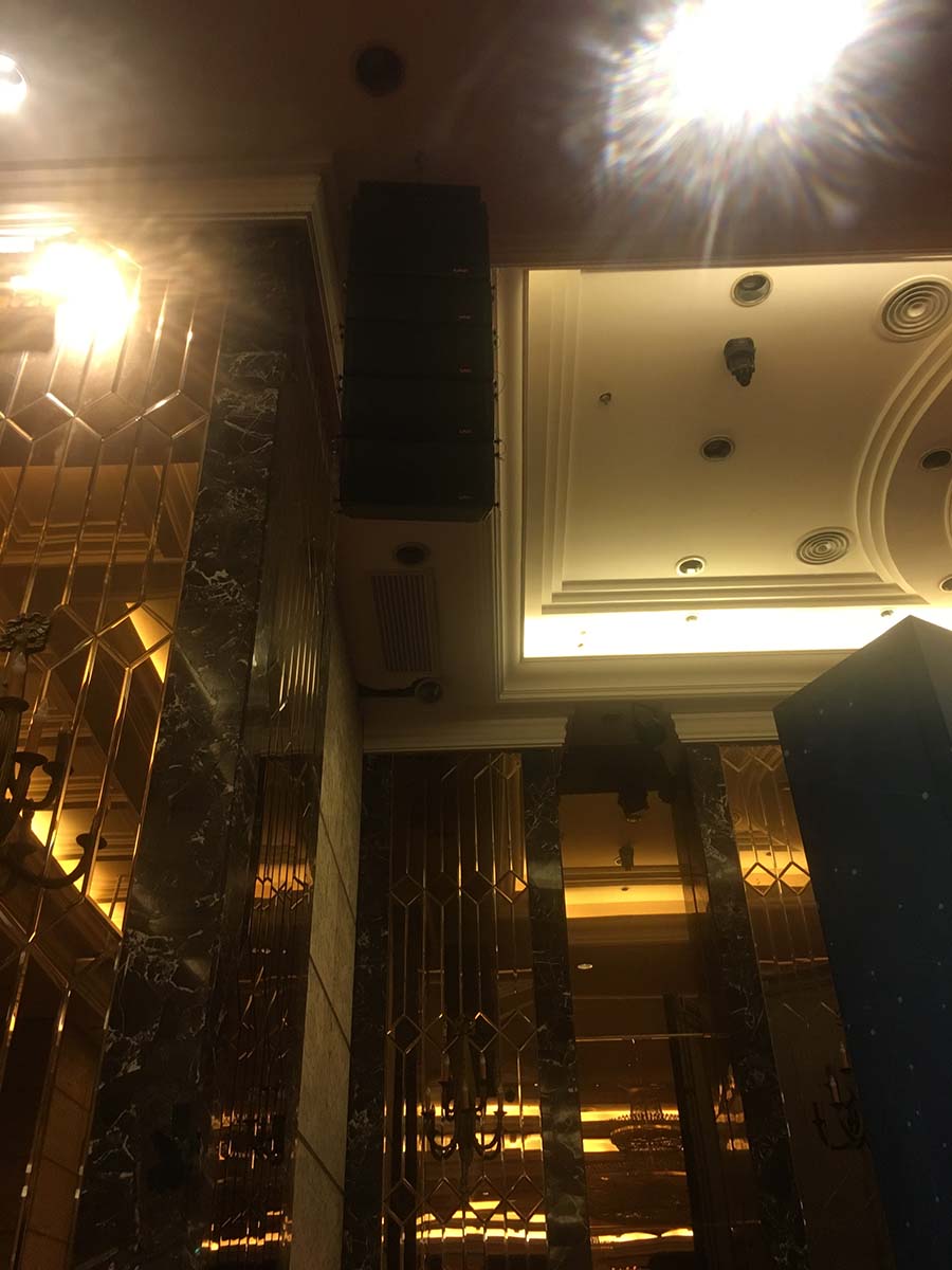 此次國(guó)際宴會(huì)廳1200平米,全部選用JBL音響,主音箱選用JBL線陣音箱,補(bǔ)聲音箱選用JBL CV系列音箱,返聽選用PRX400系列音箱。功放選用皇冠CROWN功放,BSS處理器以及萊斯康效果器,聲藝調(diào)音臺(tái)。