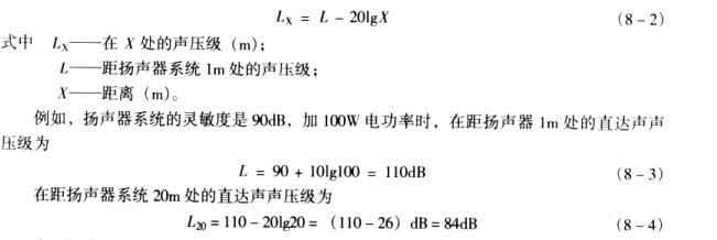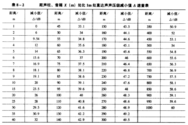 距聲柱、音箱X(m)處的直達聲聲壓級為該聲柱、音箱再加上其額定功電功率后的距離為1m處的聲壓級減去從表8-2中查得的減小值。其公式為▲=20logX,式中X為離聲柱或音箱的距離,單位為m。例如,某聲柱的額定電功率為50W,其在距離為1m處的聲壓級為115dB,設(shè)要求距離為50m處直達聲聲壓級,則根據(jù)距離為50m從表8-2中可查到其減小值為34dB,1m處的直達聲聲壓級115dB減去距離為50m時的減小值34dB,所以給該聲柱加額定功率時,在距聲柱50m處的直達聲聲壓級將應(yīng)為81dB。