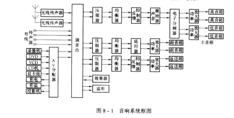 音響系統(tǒng)框圖舉例見(jiàn)圖8-1,這是一個(gè)歌舞廳音響系統(tǒng),當(dāng)然具體到某一個(gè)歌舞廳還得視歌舞廳幾何尺寸、形狀、要求水平高低、資金情況來(lái)具體設(shè)計(jì),增減設(shè)備,例如需要時(shí)還可配上攝像機(jī),把歌舞者的形象在屏幕上顯示出來(lái),以增加氣氛。