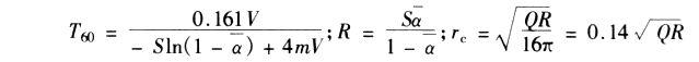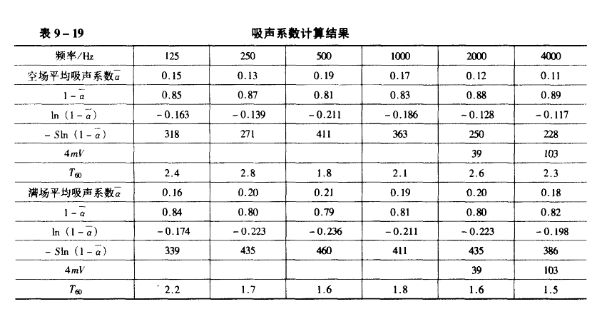 需要說明的是各種吸聲材料的吸聲系數(shù)并不是非常精準(zhǔn)的,因?yàn)樯a(chǎn)廠家的不同,材料性制可能有差異,另外混響室法和駐波管法的測(cè)試方法不同,也會(huì)造成測(cè)試參數(shù)的差異,還有安裝上也會(huì)有差異,所以最后計(jì)算出的參數(shù)供設(shè)計(jì)參考,還有用來計(jì)算混響時(shí)間的計(jì)算公式,本身并沒有保證計(jì)算的結(jié)果是非常精確的,另外公式本身是利用統(tǒng)計(jì)方法建立的,如果各種參數(shù)都是比較準(zhǔn)確的,那么計(jì)算結(jié)果誤差也許在10%以內(nèi),實(shí)際上建筑設(shè)計(jì)的結(jié)果在最后完成裝修后各頻率的混響時(shí)間還要靠測(cè)試來驗(yàn)證,必要時(shí)還要適當(dāng)調(diào)整才能達(dá)到預(yù)定要求。所以計(jì)算過程中不必選取太多有效位數(shù)值,那種為了數(shù)據(jù)精確計(jì)算過程中保留小數(shù)點(diǎn)后很多位的做法,只增加計(jì)算的工作量,對(duì)工程設(shè)計(jì)毫無貢獻(xiàn),至于各種裝修材料的吸聲系數(shù)值,請(qǐng)參考中國(guó)建筑工業(yè)出版社出版的(建筑聲學(xué)設(shè)計(jì)手冊(cè))中國(guó)建筑科學(xué)研究院建筑物理研究所主編,和上??茖W(xué)技術(shù)出版社出版的(噪聲控制技術(shù))國(guó)家勞動(dòng)總局主編,方丹群,王文奇,孫家其,陳潛等編等書的有關(guān)表格。計(jì)算出空?qǐng)龊蜐M場(chǎng)1000hz的混響半徑大約分別在8米和8.5米,頻率增高時(shí),混響半徑稍微再減短一些,但是減短的數(shù)值并不大,見表9-19。