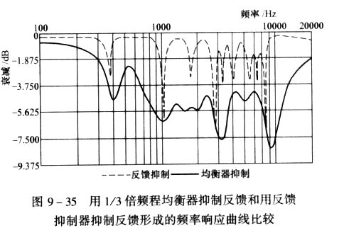 圖9-34是1/3倍平成均衡器的濾波器帶寬與反饋抑制器窄帶濾波器帶寬的比較,從圖上可以看出反饋抑制器的窄帶濾波器的帶寬遠遠比1/3倍頻程均衡器濾波器的帶寬小得多,當然反饋抑制器窄帶陷波濾波器對音質的影響也遠遠比1/3倍頻程均衡器小得多,圖9-35舉例說明,用1/3倍頻程均衡器抑制反饋和用反饋抑制器抑制反饋形成的頻率響應曲線比較,其中粗實線代表1/3倍頻程均衡器,細實線代表反饋抑制器窄帶陷波濾波器,顯然用反饋抑制器后的頻響曲線對音質的影響要好于用1/3倍頻程均衡器。